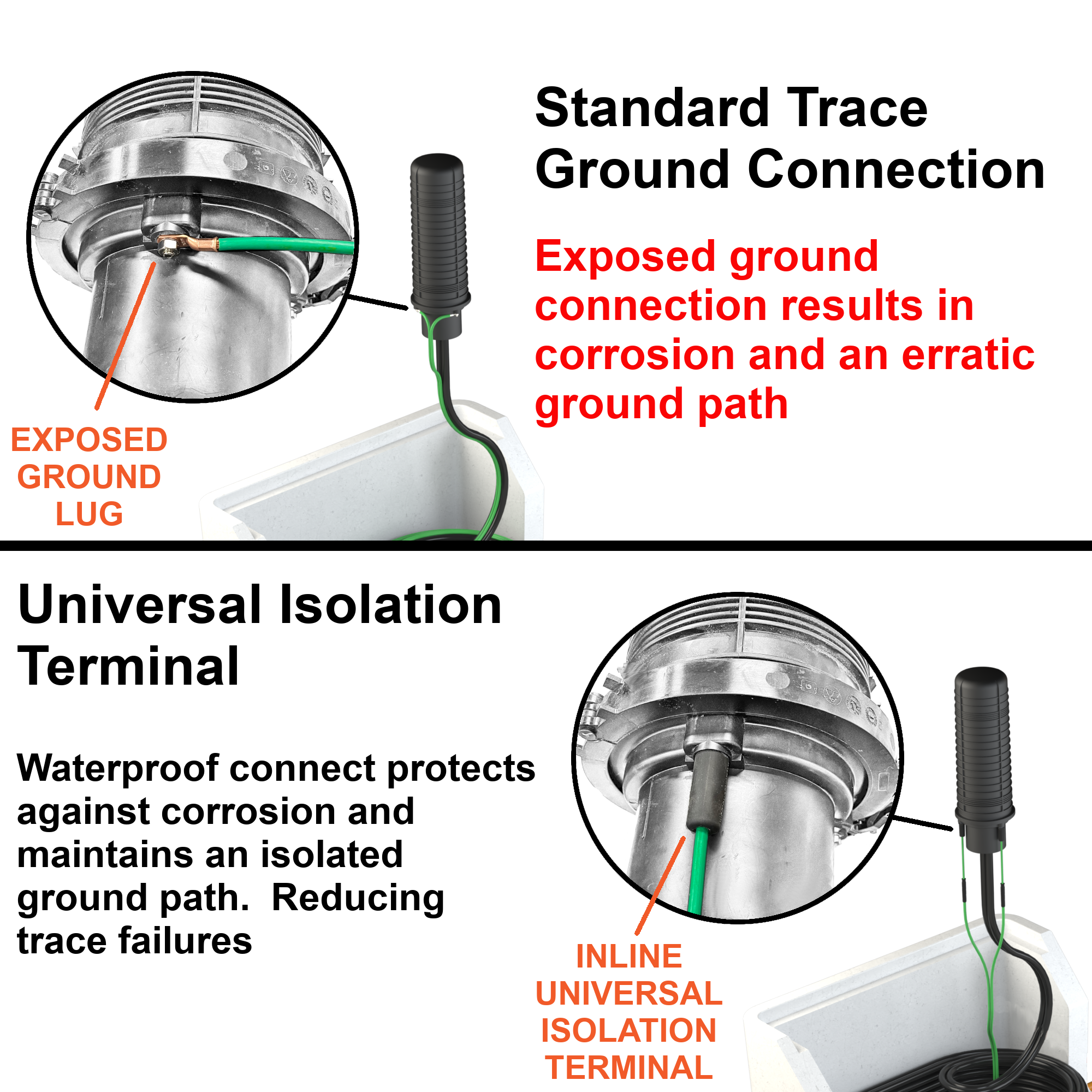 The Universal Isolation Terminal (UIT) was designed to provide an insulated, watertight connection to the external grounding lug on a variety of splice enclosures. This feature is essential for cable locating applications, especially in challenging environments.